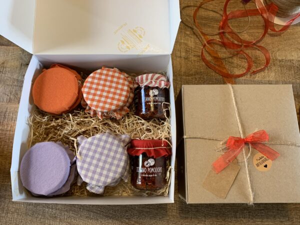 Scatola con 6 vasetti, componibile scegliendo tra Viola Melanzana, Ambra Zucca, Tiziano Pomodoro e Giada Zucchina